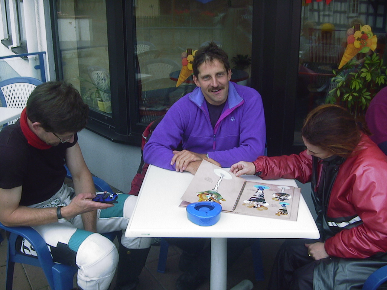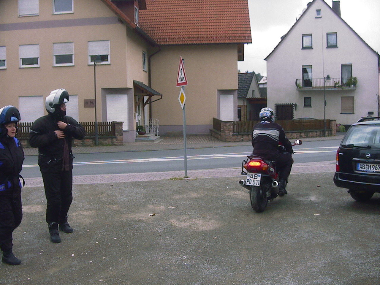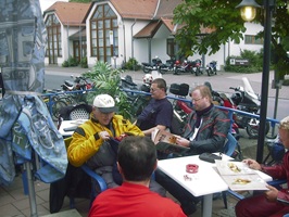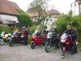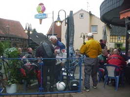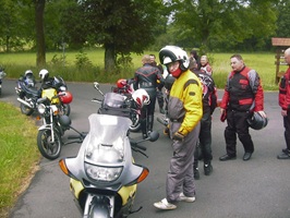 | Dort musste wir eine Pause einlegen, da zwei Motorräder in Leubach die Abfahrt verpass und die Gruppe verloren hatten. Aber ich hatte ja eine genaue Fahrtroute verteilt und sie stießen wenige Minuten später wieder zu uns. Die Wartezeit hatte Gudrun überbrückt, indem sie versuchte Srecko einen Walzer beizubringen. |