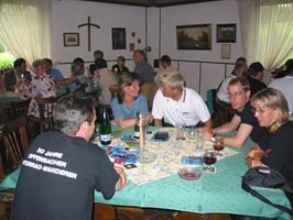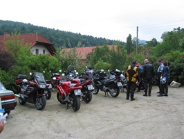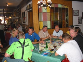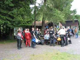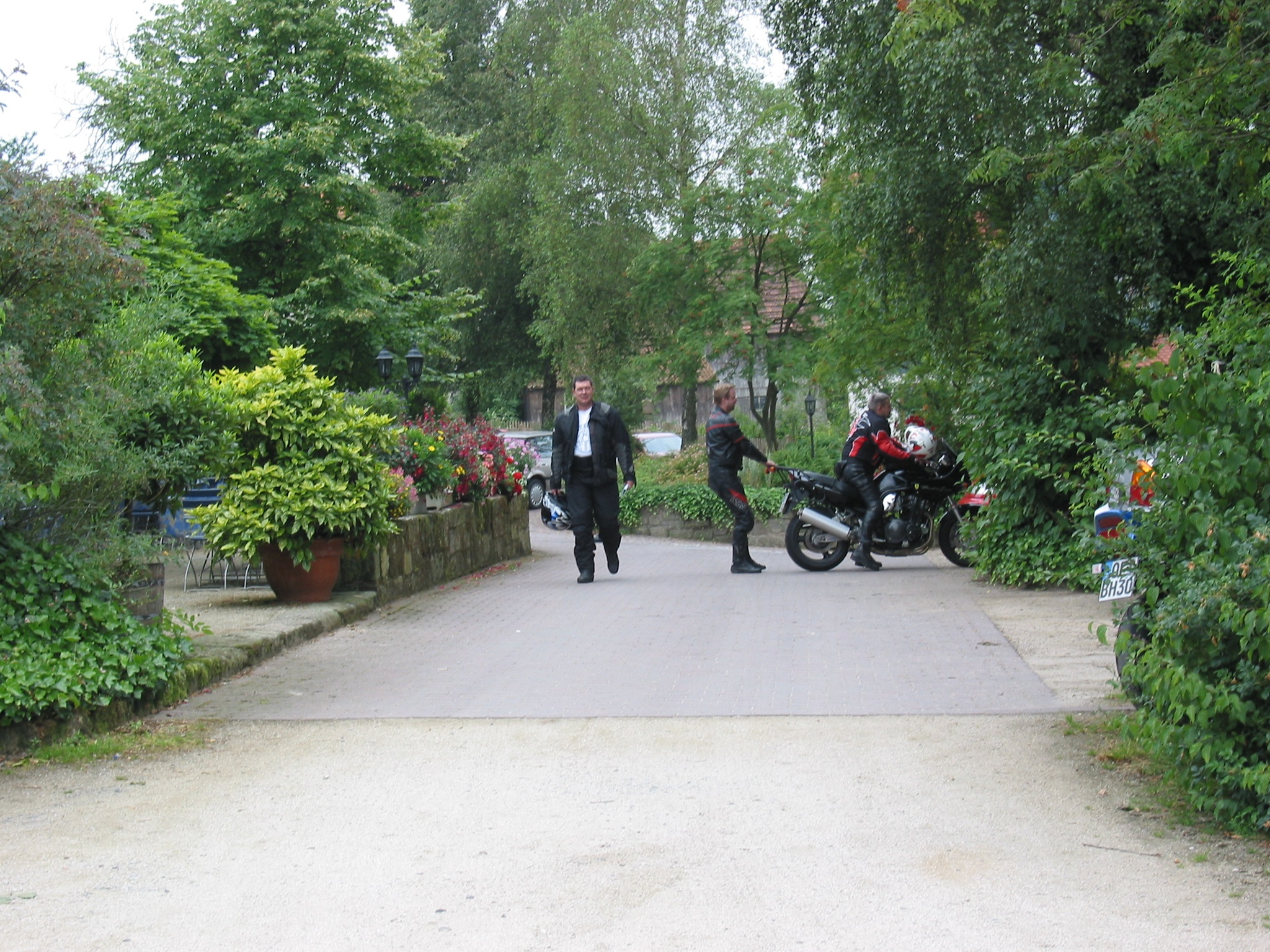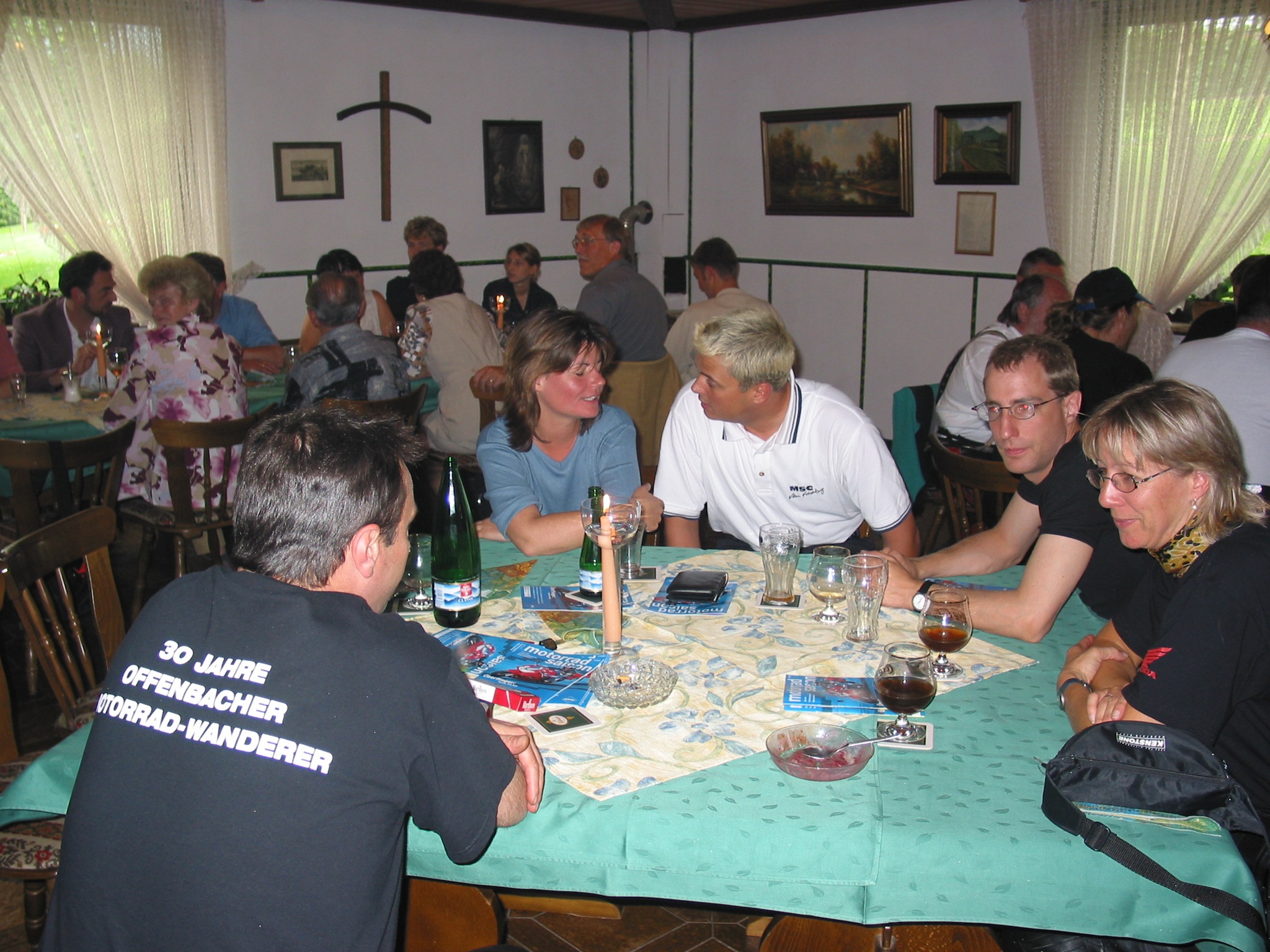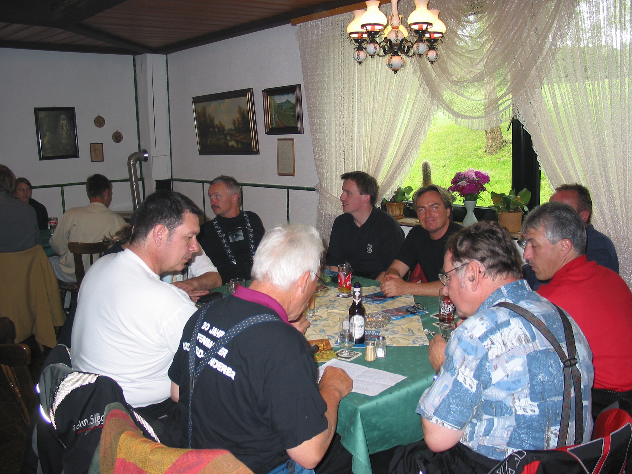 | Gegen 10:00 h ging es weiter über Jossgrund - Burgjoss - Fellen - Burgsinn - Rossbach - Wernarz - Bad Brückenau - Riedberg - Eckartsroth - Wildflecken - auf der B279 links nach Gersfeld zum Tanken. Von dort über die B248 über Obernhausen (ich glaube hier war das Stück, wo jeder dachte dass wir uns verfahren hätten da wir einen ewig langen Waldweg, der nur geschottert ist, befuhren) Abtsroda - Sieblos bis Tränkhof. Im Restaurant "Alt-Tränkhof" (Telefon: 06658-274) kann ich mich noch an ein sehr leckeres Buffet für 12,20€ erinnern. Wurde da Alex mit Gewalt wieder aus dem Lokal |