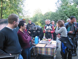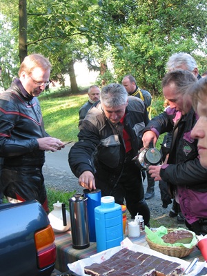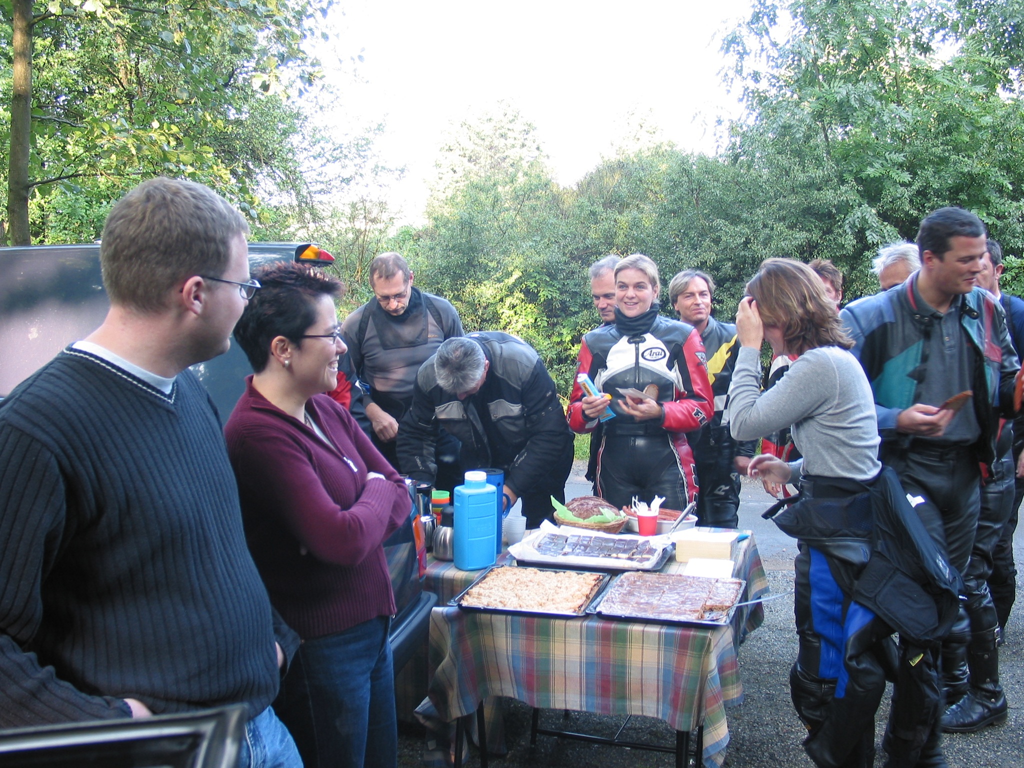 | Dort erwartete uns ein super organisiertes Frühstück. Mike hatte seine ganze Familie mit eingespannt die auf dem Parkplatz bereits auf uns wartete. Kaffee, Tee und Säfte sowie mehrere Bleche mit frischem selbstgebackenem Kuchen.Ja wer nicht dabei war kann zurecht neidisch werden. Ein besonderer Dank für die Unterstützung und das Engagement !!! |
