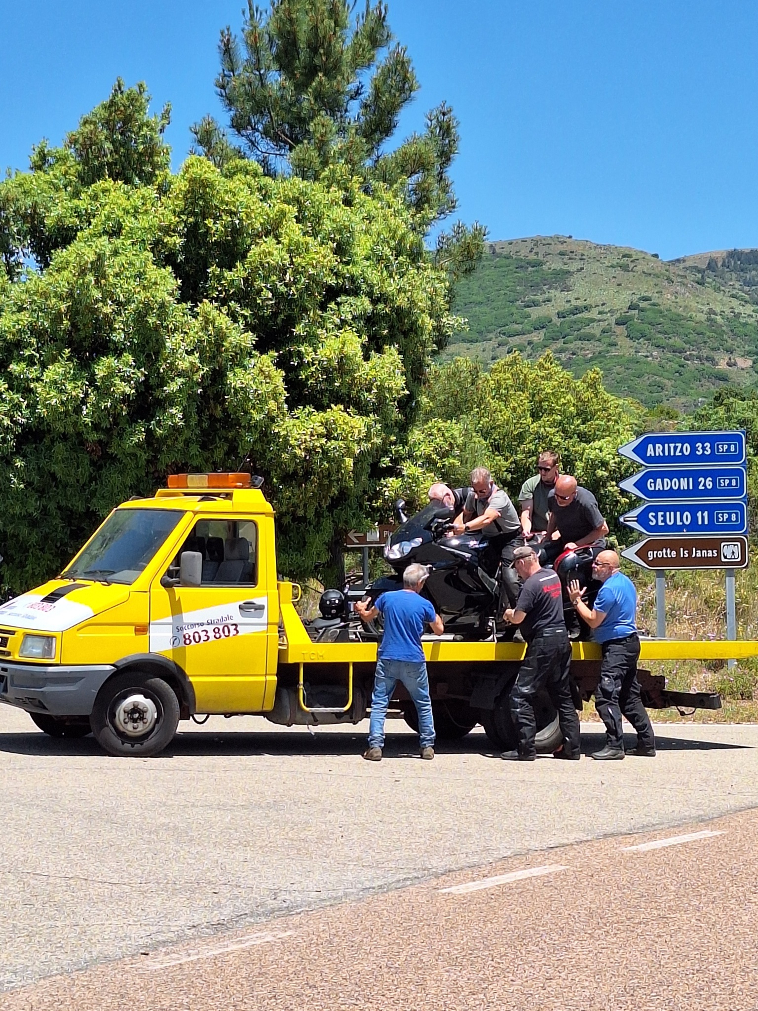 Am folgenden Tag war Hans unser Tourguide und führte uns Richtung Nordwesten. Er hatte auch eine sehr schöne Tour geplant. Wie bei den anderen Touren konnten wir die Kurven und die Landschaft Sardiniens bestaunen. Wieder im Hotel angekommen ließen sich einige ein kühles Bierchen schmecken, andere hüften in den Pool. Alle wollten Abkühlung. Motorrad fahren auf Sardinien ist schon sehr anspruchsvoll und alle merkten die Hitze (teilweise über 33 Grad). Bei einem gemütlichen Abendessen ließen wir den Tag ausklingen. Am folgenden Tag war Thomas K. unser Tourguide. Er hatte sich vorgenommen den Lago di Mulargia zu umrunden. Leider kam ihm eine etwas abenteuerliche kleine Straße, die in einer Privatstraße endete, in die Quere. Aber gemeinsam schafften es alle die Motorräder zu drehen und konnten die Strecke unbeschadet wieder hochfahren. Weiter ging es dann auf etwas größeren und kurvenreichen Straßen durch die wunderschöne und abwechslungsreiche Landschaft. Mittagspause machten wir in einem Pub in Barumini. Als wir wieder im Hotel ankamen, genoss jeder seine individuelle Abkühlung (Bier, Pool, Dusche), denn auch dieser Tag war sehr heiß. Am nächsten Tag war Fredi unser Tourguide. Er hatte sich wie alle anderen Tourguides sehr viel Mühe gemacht und eine weitere Tour durch die wundervolle Landschaft Sardiniens geplant. Leider störte eine Frauenstimme den Ablauf der Tour und so endete die Tour bei Sardali. Aber hier konnte man wieder einmal sehen, dass MWOler zusammenhalten und keinen allein lassen. Gemeinsam warteten wir auf den italienischen ADAC. Wir waren alle positiv überrascht, wie super das Abschleppen und die Organisation funktioniert hat. Hilfsbereit stand uns auch der ehemalige Bürgermeister von Mainflingen zur Seite.