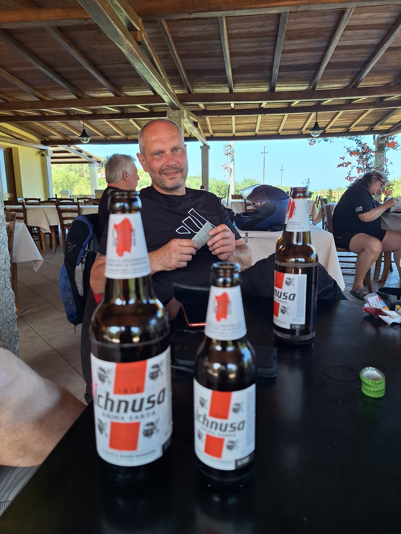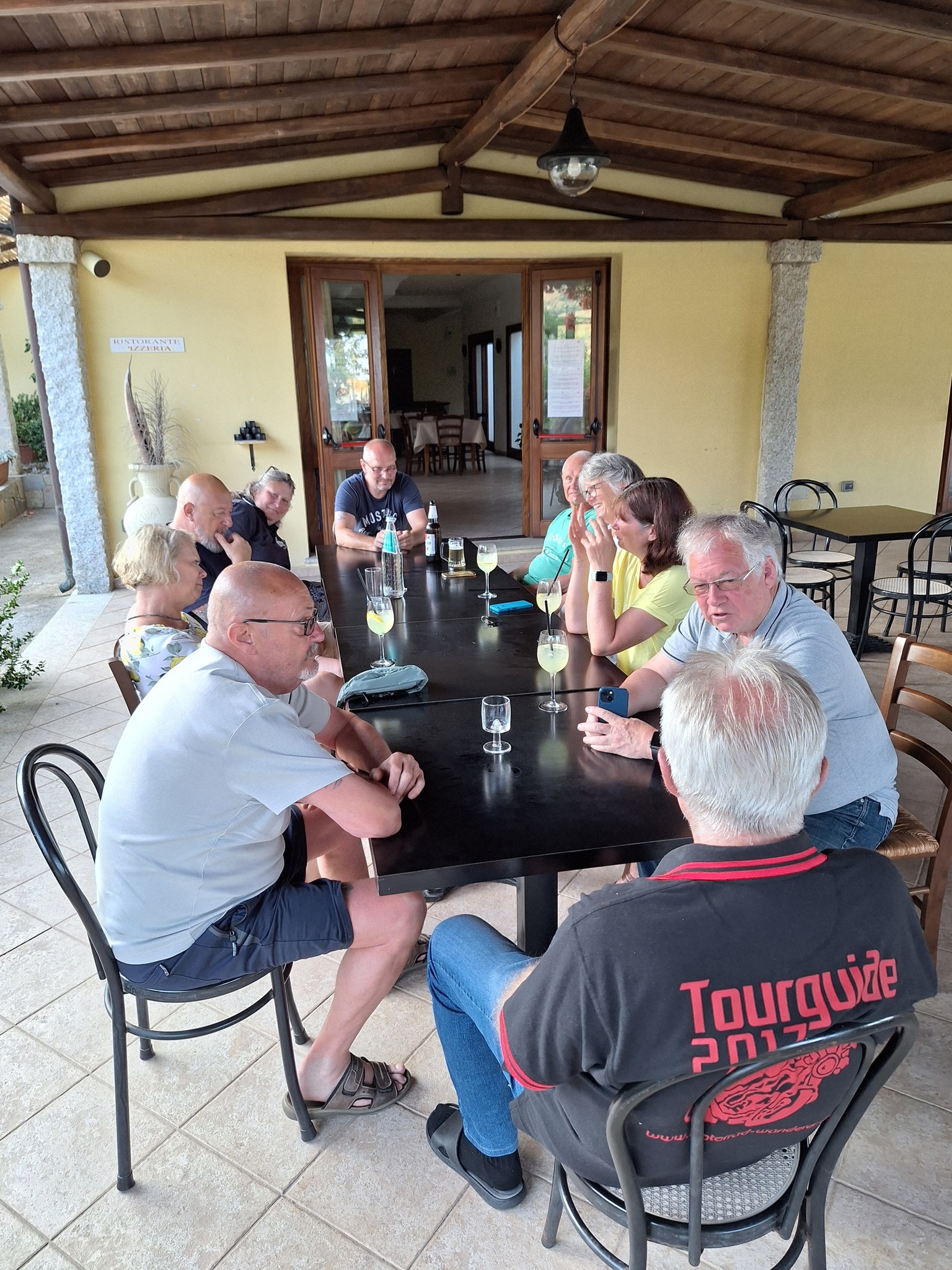Am nächsten Tag machten wir uns nach dem Frühstück gestärkt auf zu unserer ersten Tour. Unser Tourguide war Ko. Er führte uns an der Ostküste Richtung Norden. Die Strecke war landschaftlich sehr schön und es gab Kurven ohne Ende. Am Hafen von Cala Gonone saßen wir in einer Kneipe und ließen uns ein Eis oder einen Salat schmecken. Dann ging es wieder Richtung Hotel zurück. Am nächsten Tag war Niko unser Tourguide. Auch er hatte eine sehr schöne kurvenreiche Strecke in den Süden der Insel herausgesucht. Es gab wunderschöne Ausblicke auf das Meer. In einer Pizzeria machten wir Pause und ließen uns Pinsa, Burger, Sandwiches und mehr schmecken. Trotz dieser umfangreichen mittäglichen Stärkung schmeckte das Abendessen im Hotel auch noch und wir ließen den Abend bei einem kühlen Bier, Wein, etc. enden.